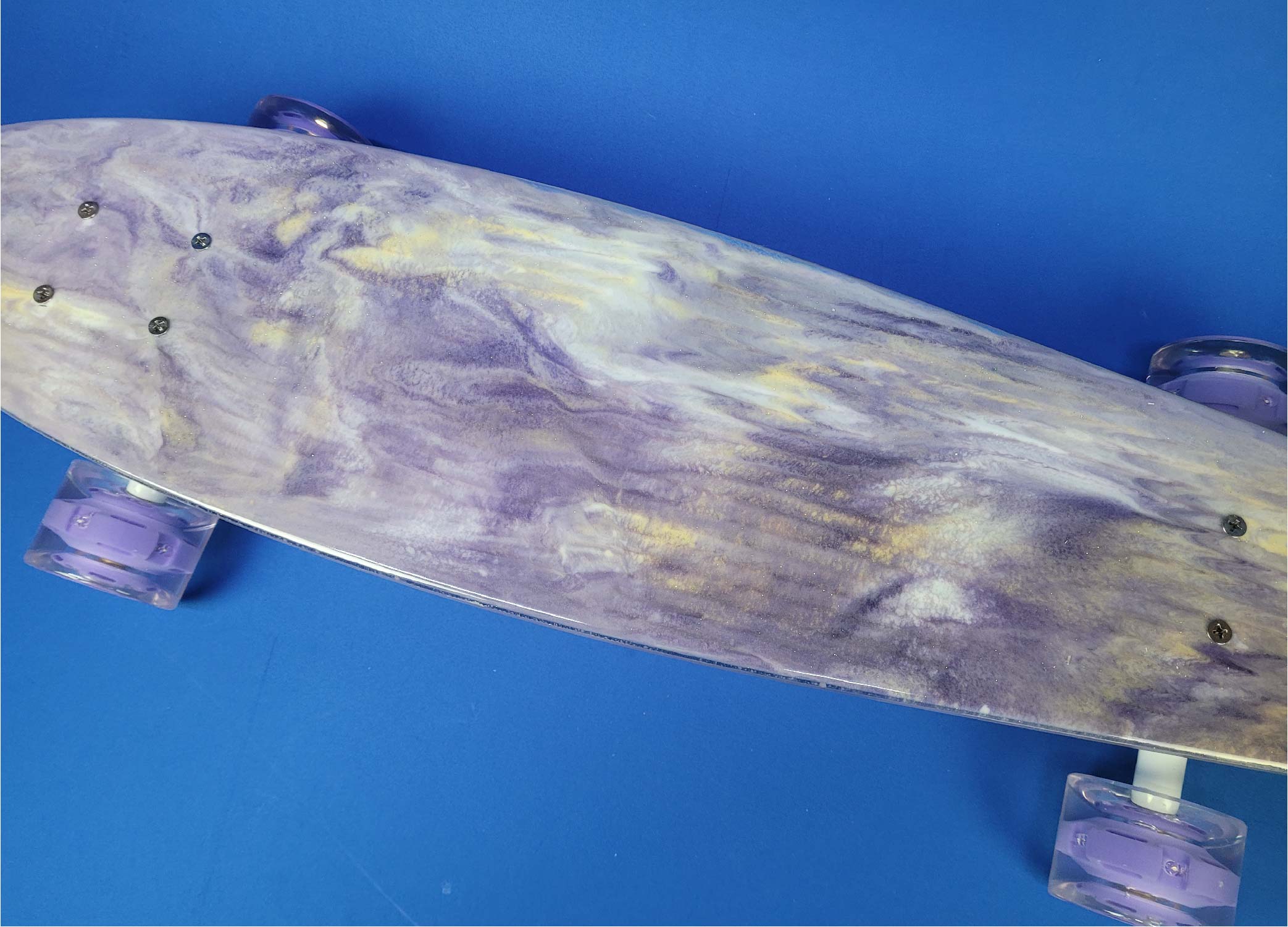 This board is a 30″ penny board with a custom poured resin design. It has white trucks and purple LED wheels.