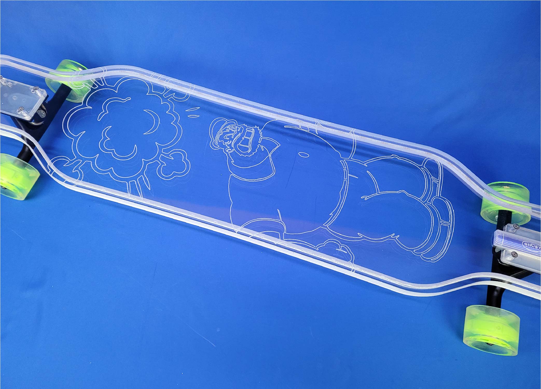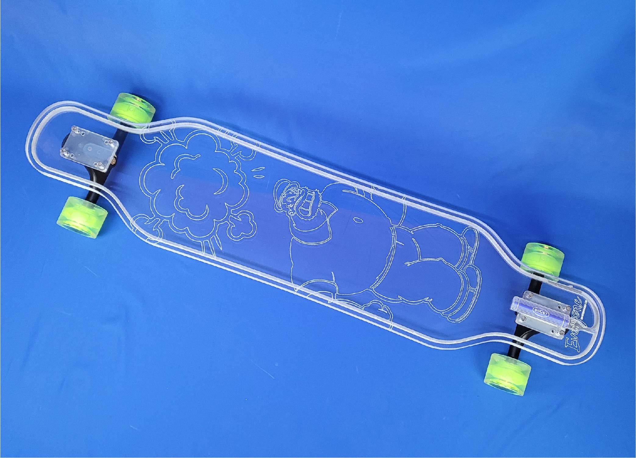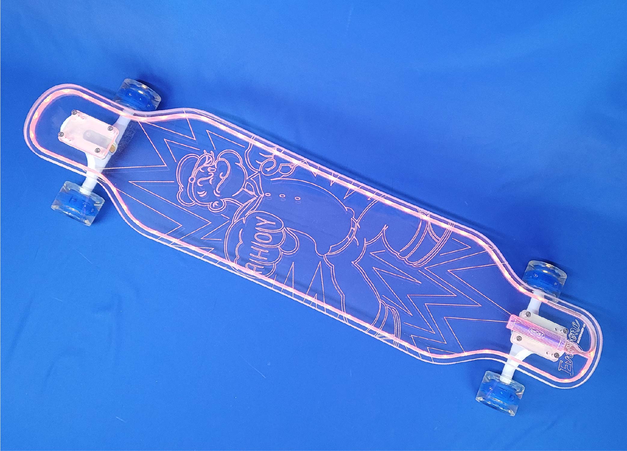 This board is a 40″ platypus design with the Brutus design from our Popeye collection. It has a full-LED deck with black trucks and green LED wheels.