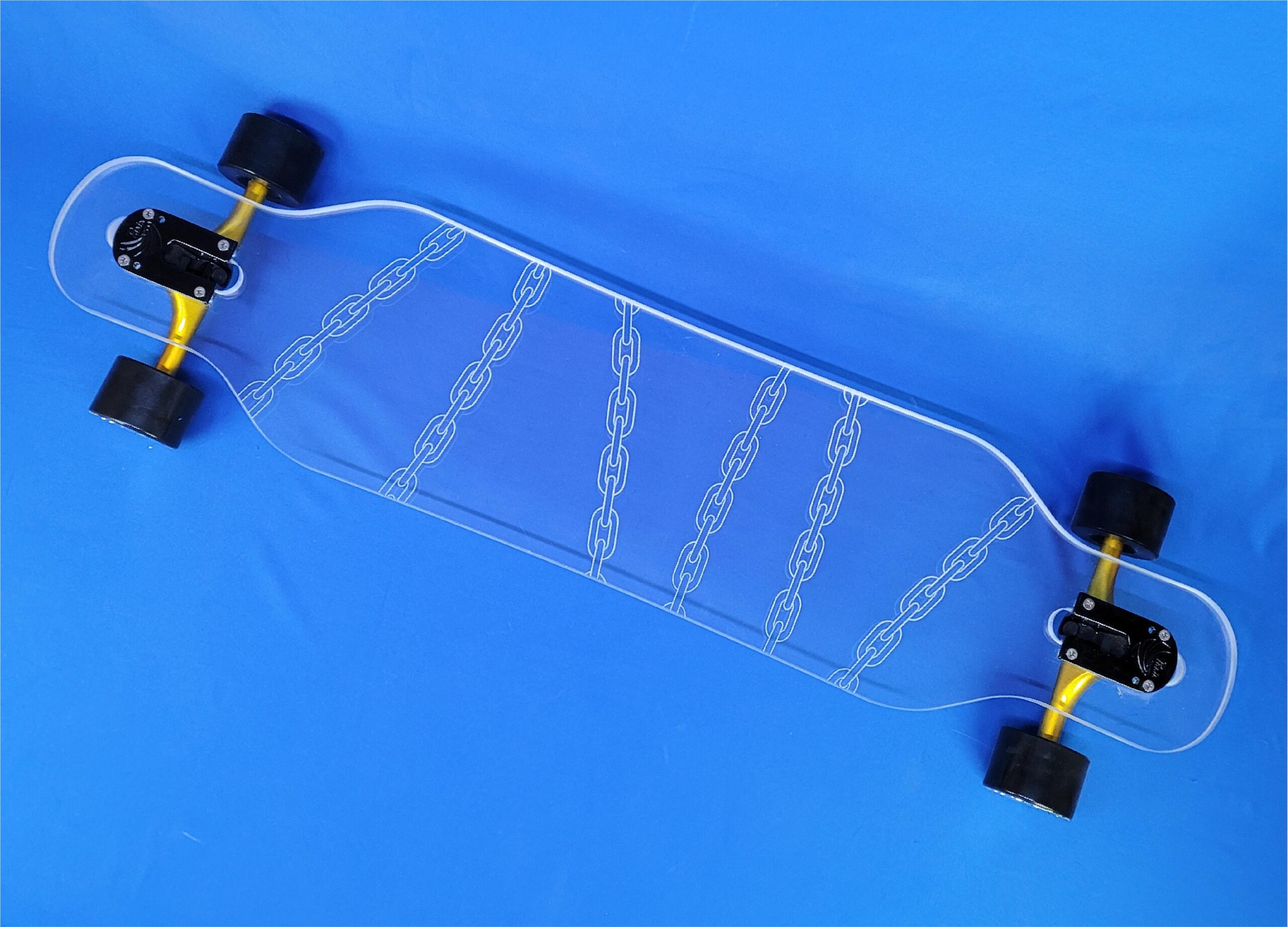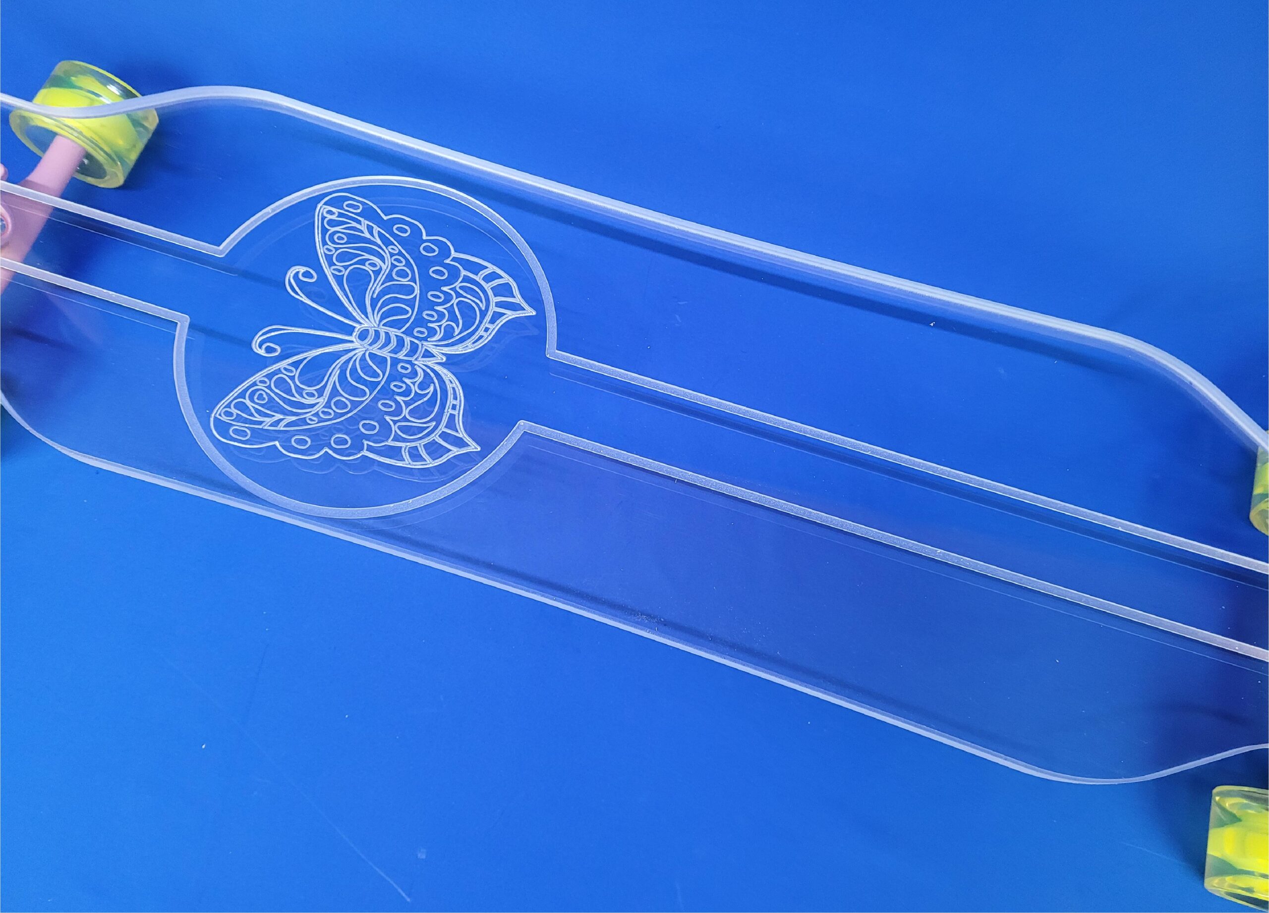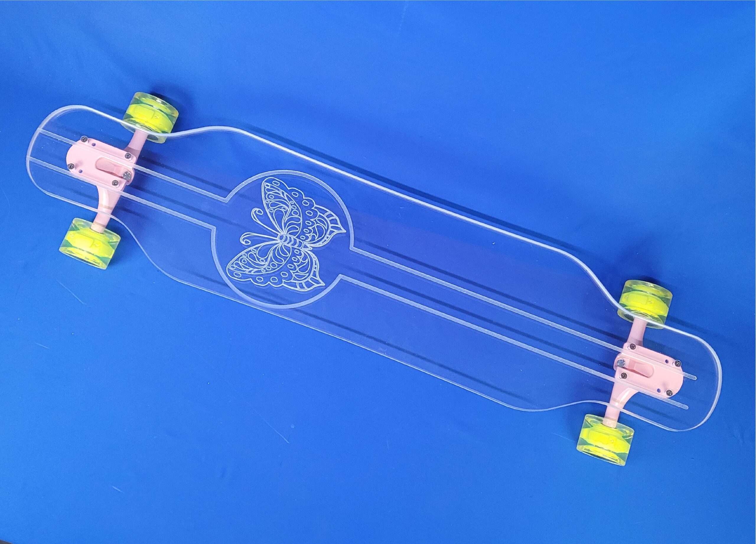 This board is a 40″ platypus with the Butterfly design. It has pink trucks and yellow LED wheels.