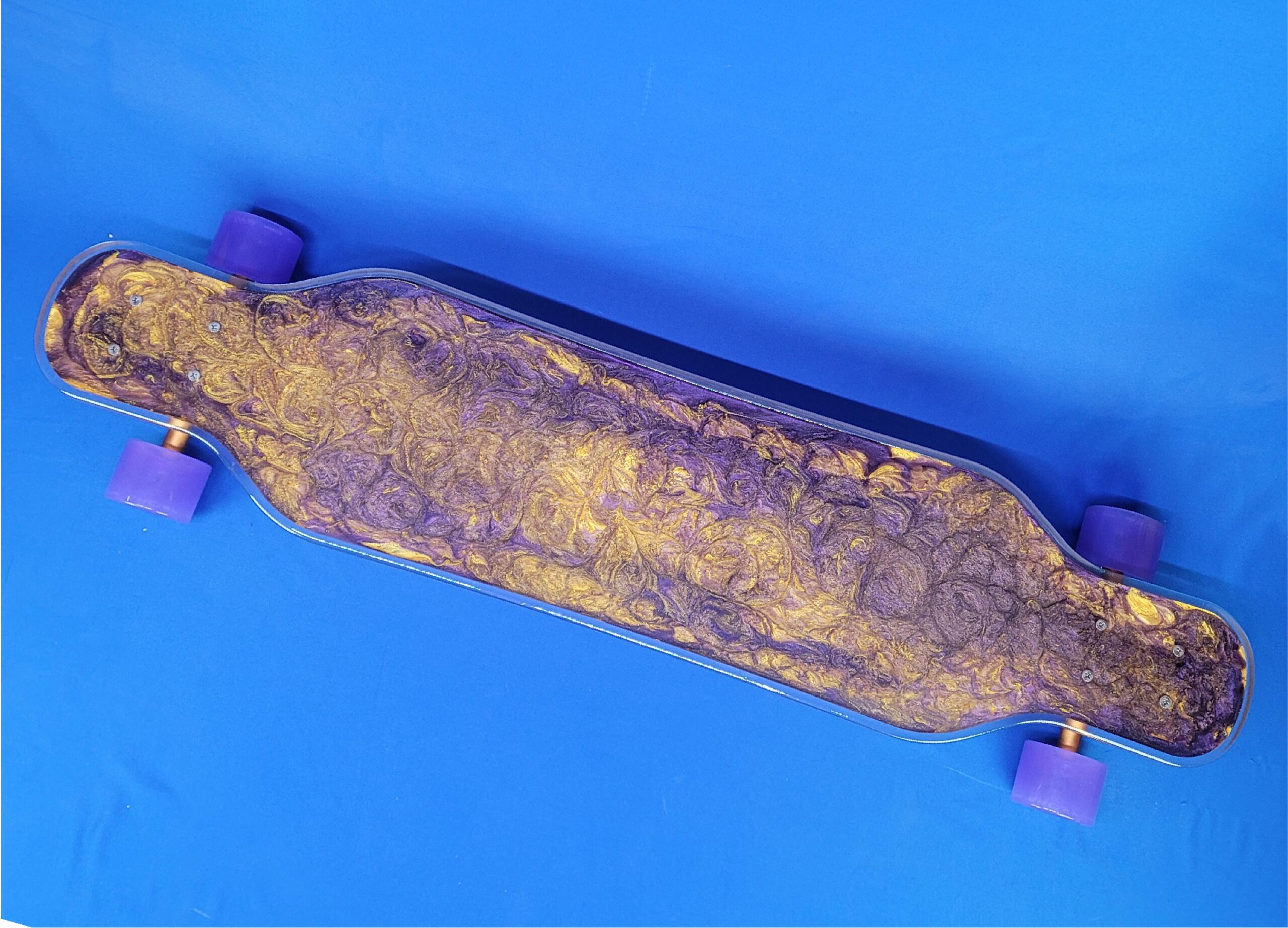 This board is a 40″ platypus board with a custom resin design. It has an orange deck with blue trucks and orange Jelly wheels.