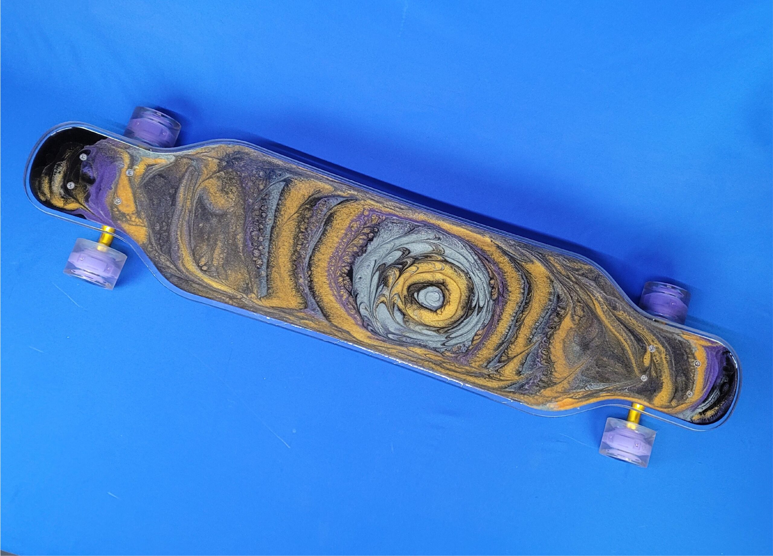 This board is a 40″ platypus board with a custom resin design.  It has gold trucks and solid purple wheels.