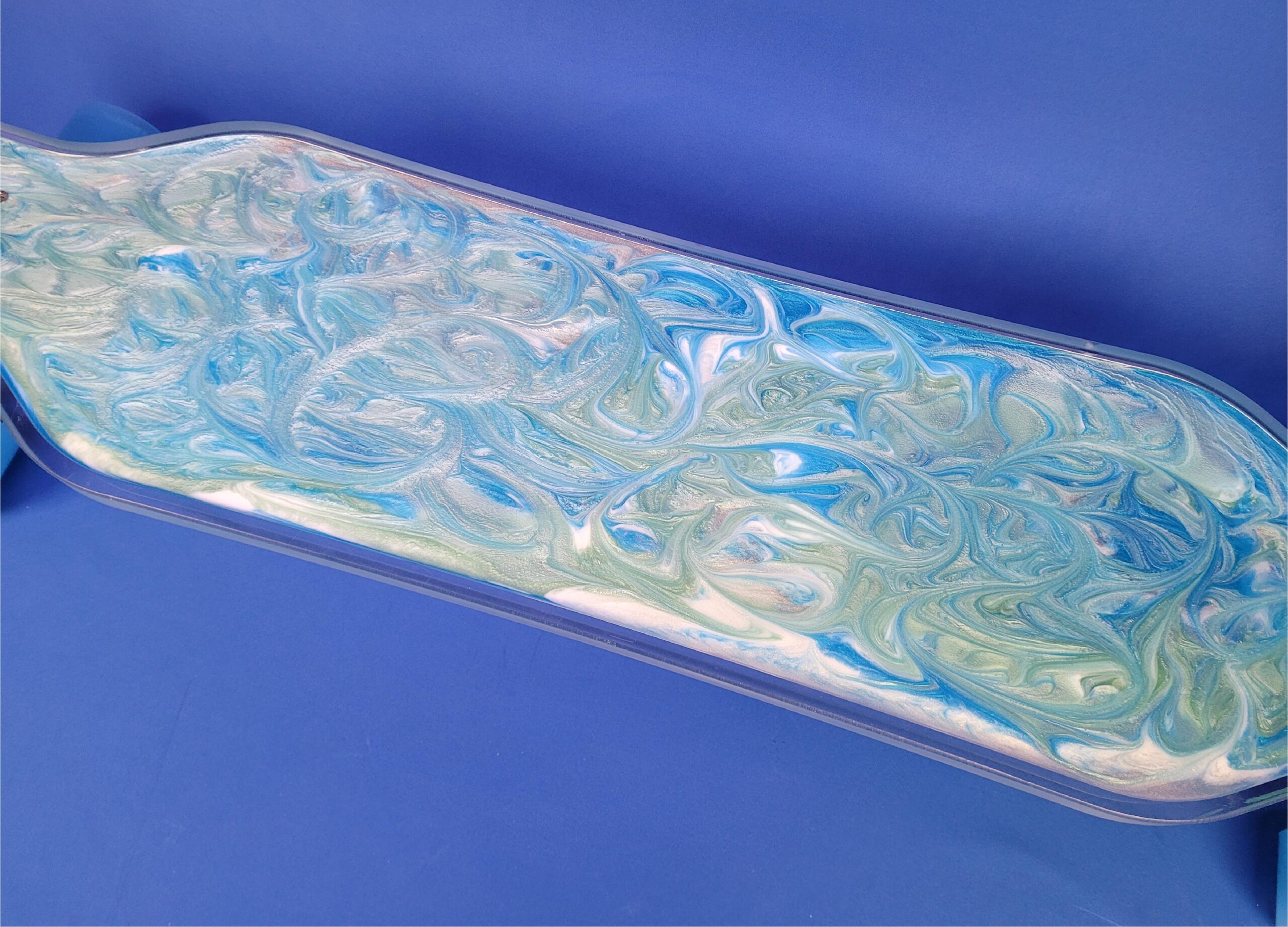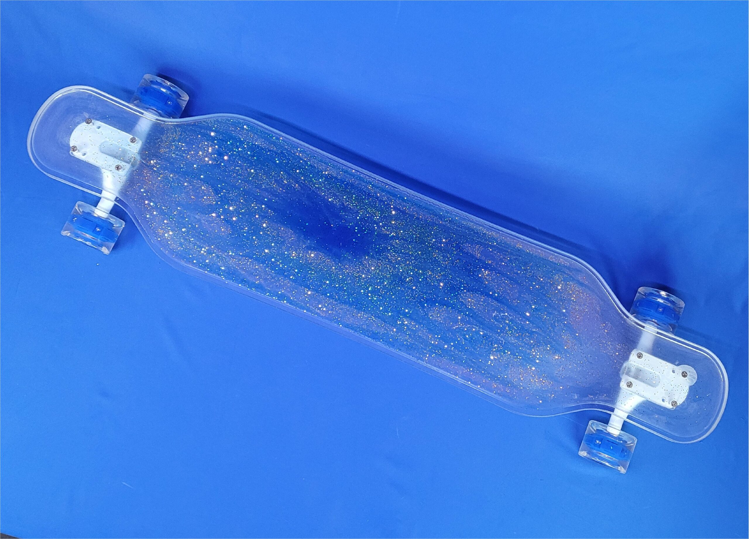 This board is a 40″ platypus board with a custom resin design. It has Paris blue trucks and blue Jelly wheels.