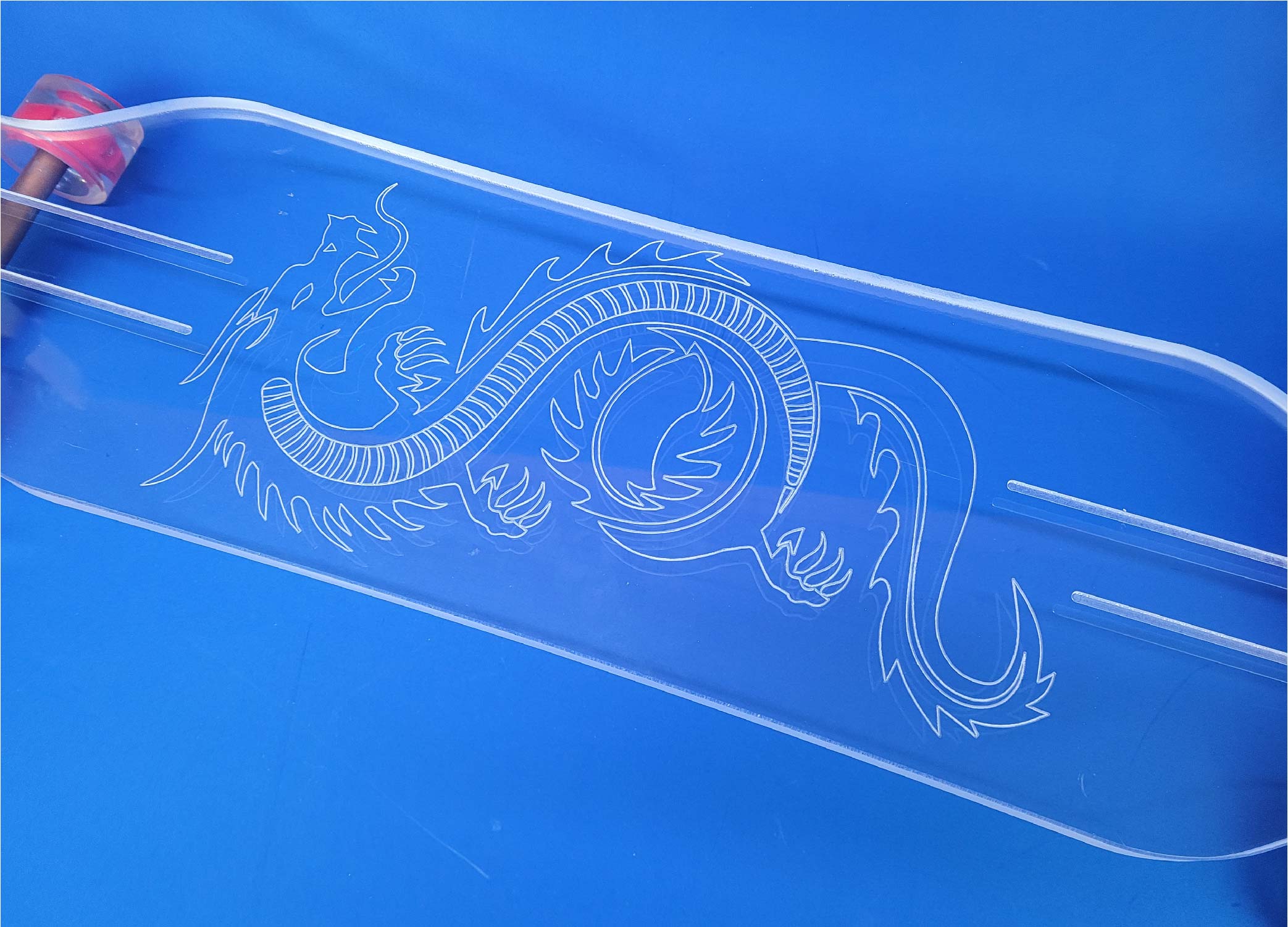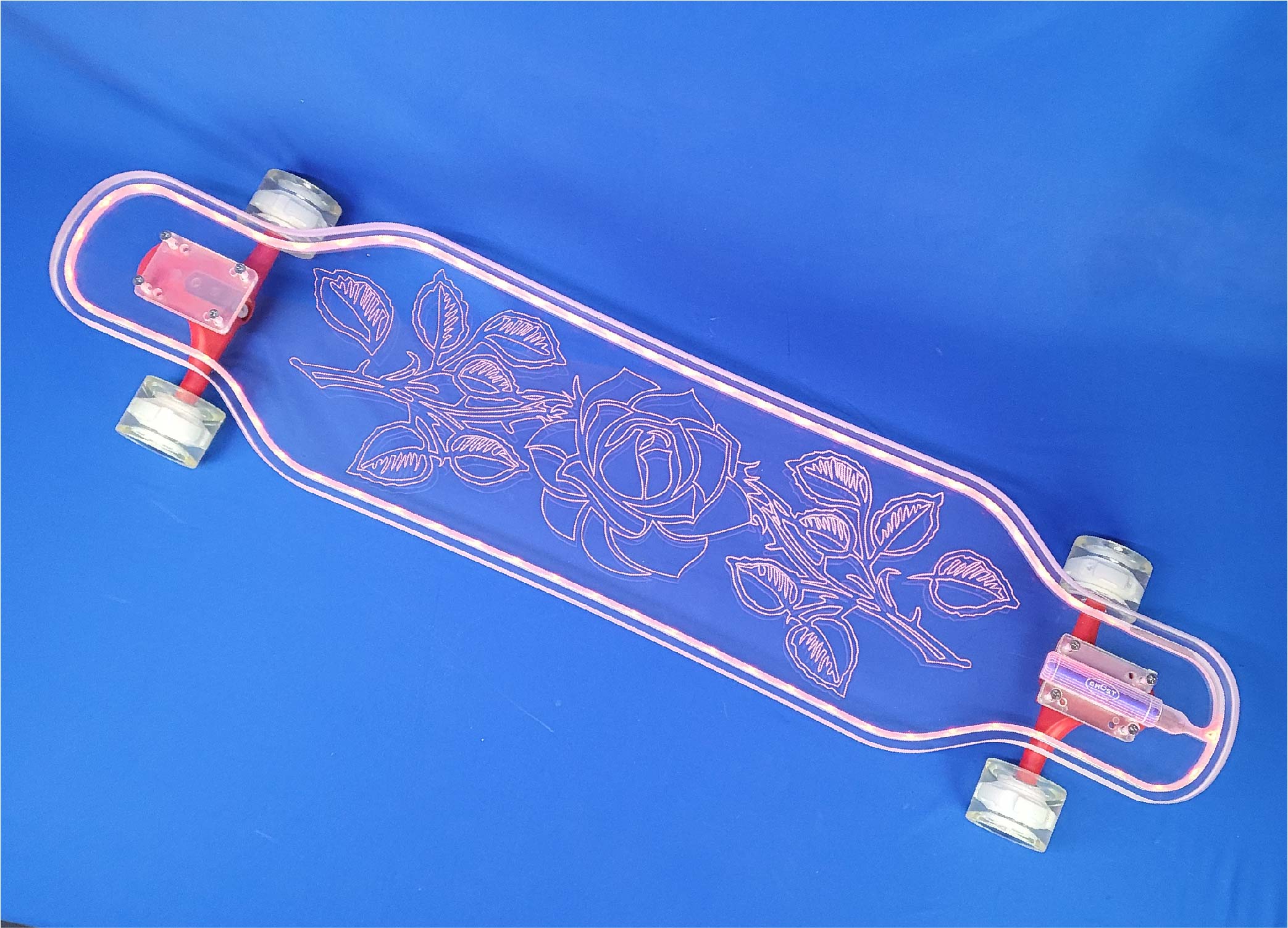 This board is a 40″ platypus design with our Dragon design. It comes with gold trucks and red LED wheels.