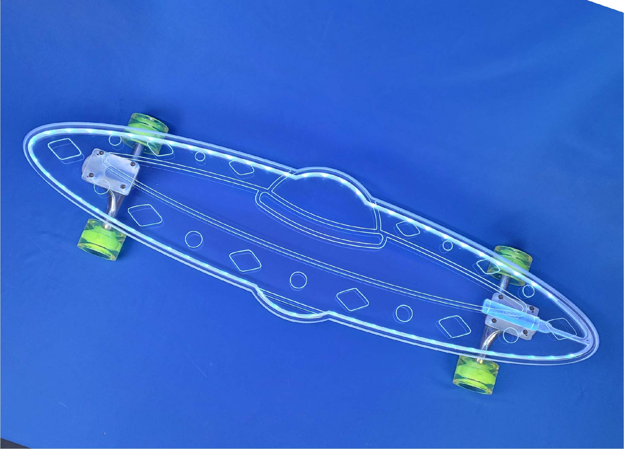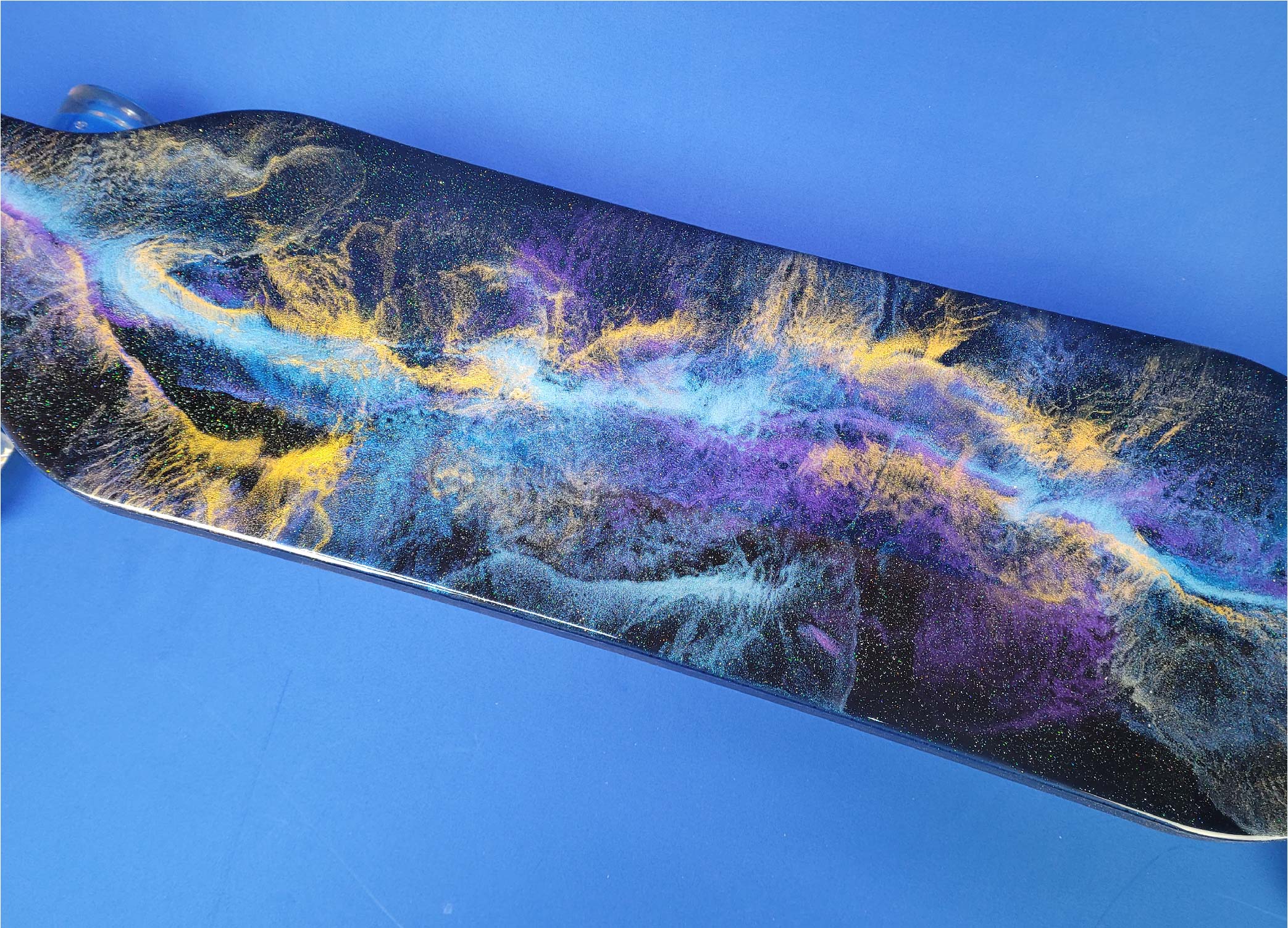 This board is a 40″ platypus design with a custom resin outer space design. It comes with black trucks and blue LED wheels.