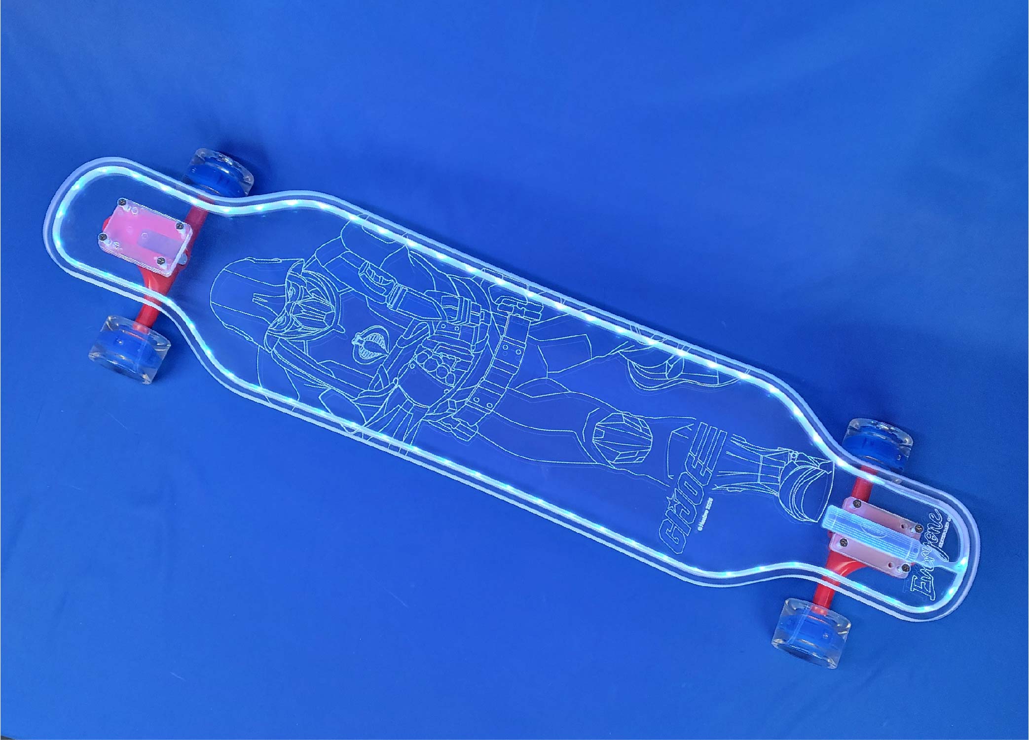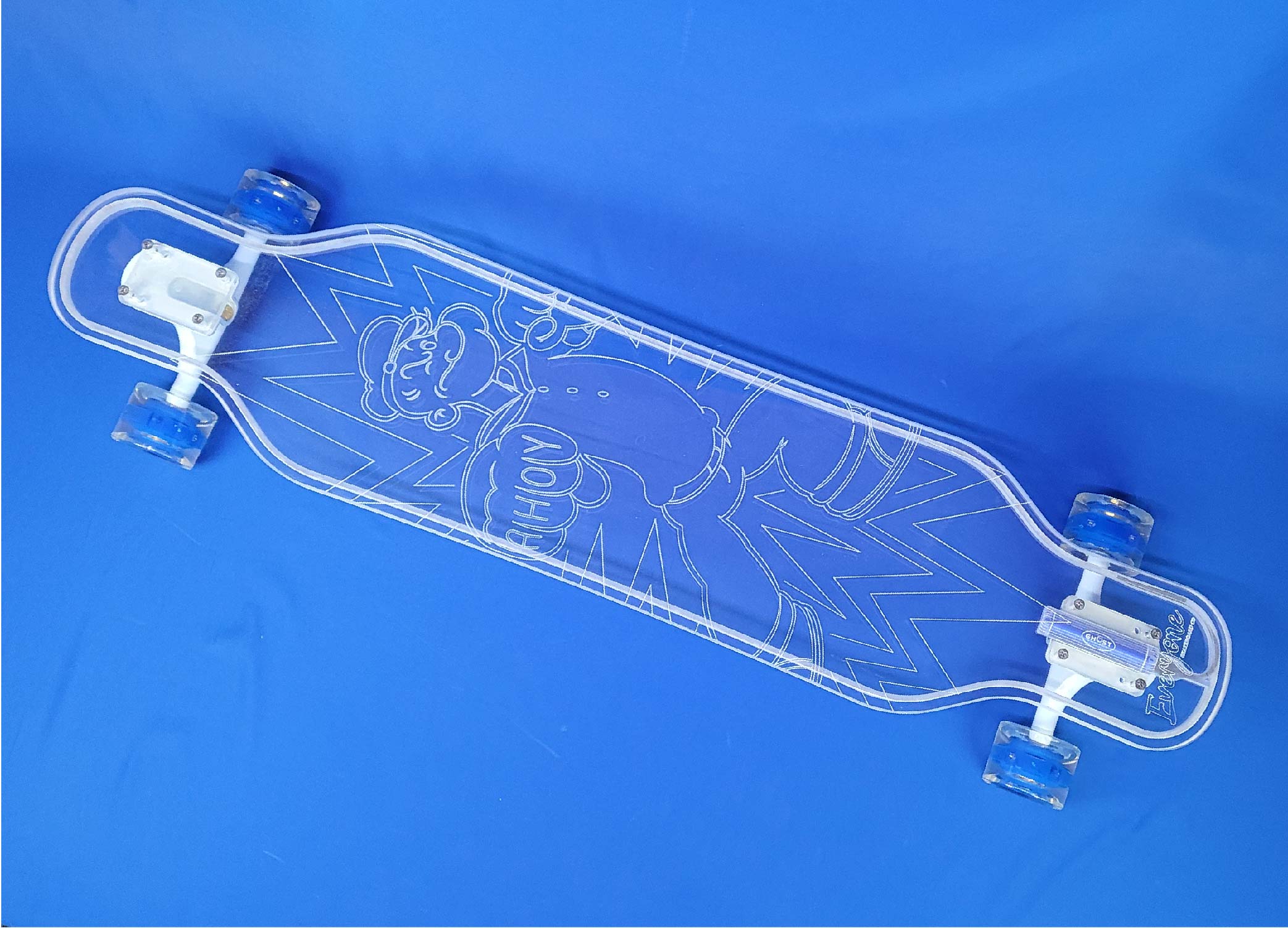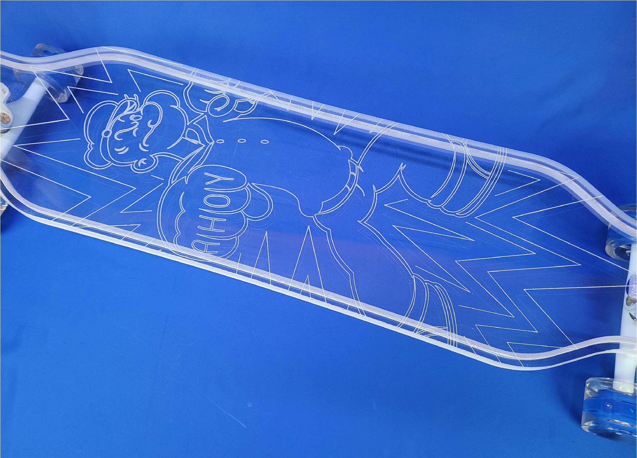 This board is a 40″ platypus design with the Popeye Ahoy design from our Popeye collection. It has a full-LED deck with white trucks and blue LED wheels.