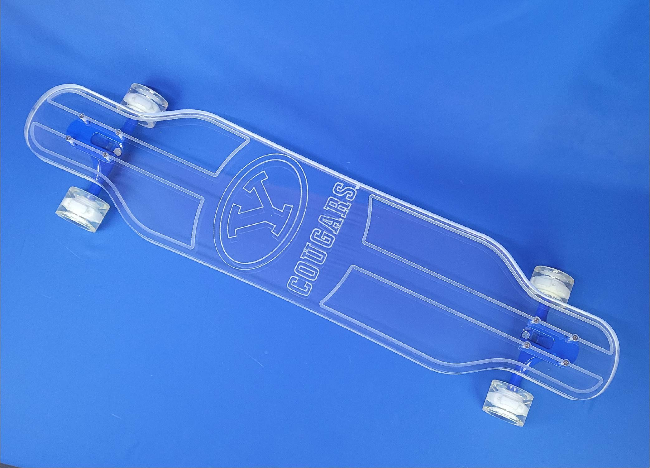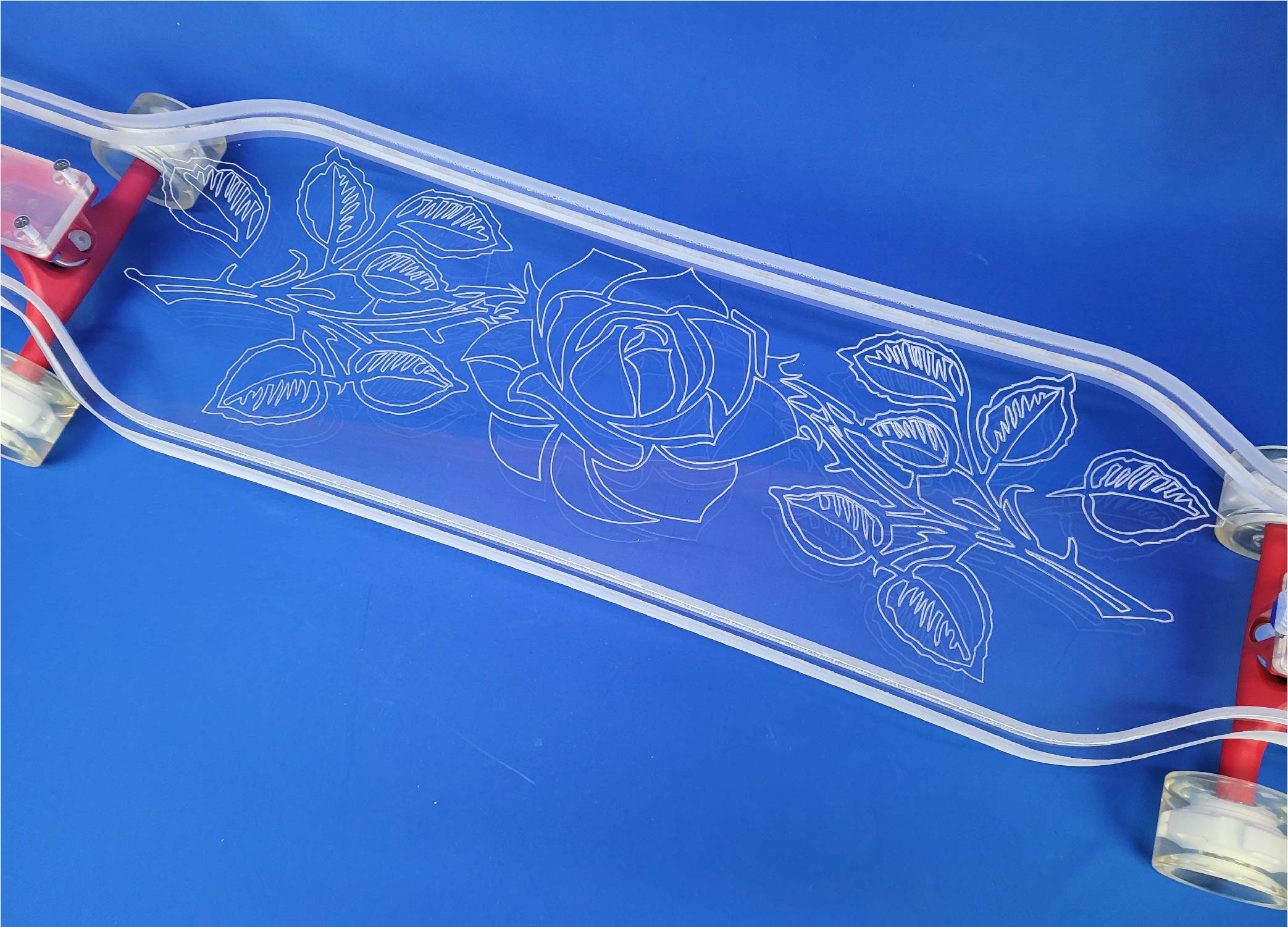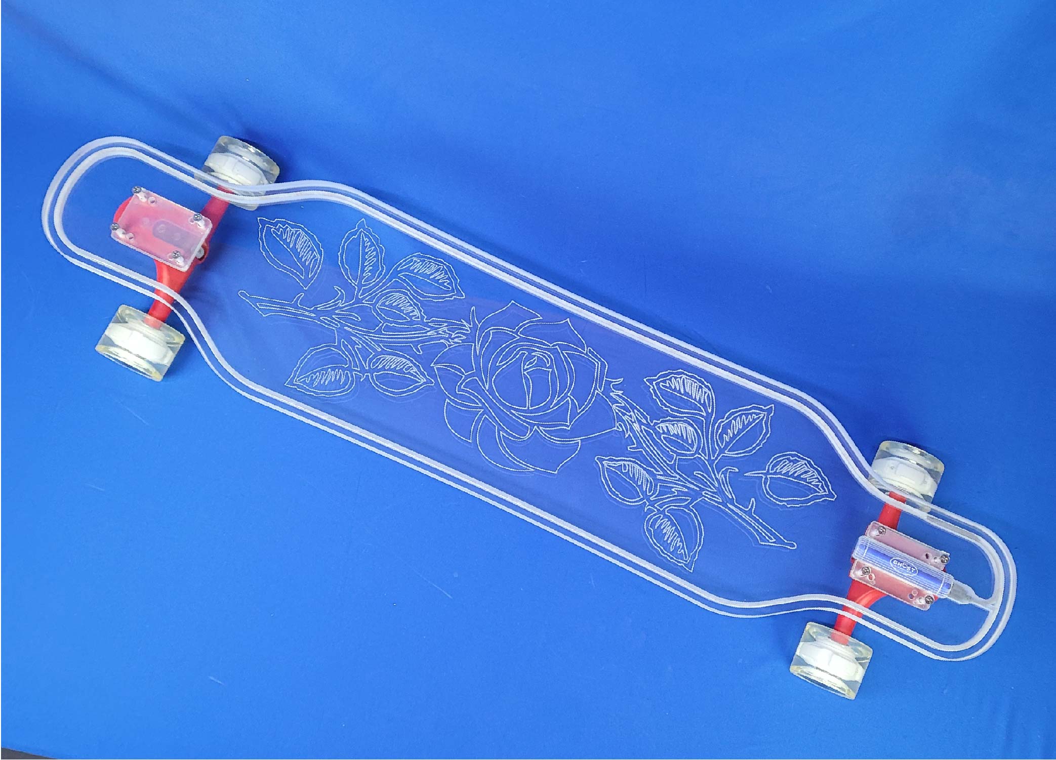 This board is a 40″ platypus design with our Rose design.  It has a 1″ thick deck for riders over 225 lbs and full LEDs.  It comes with red trucks and white LED wheels.