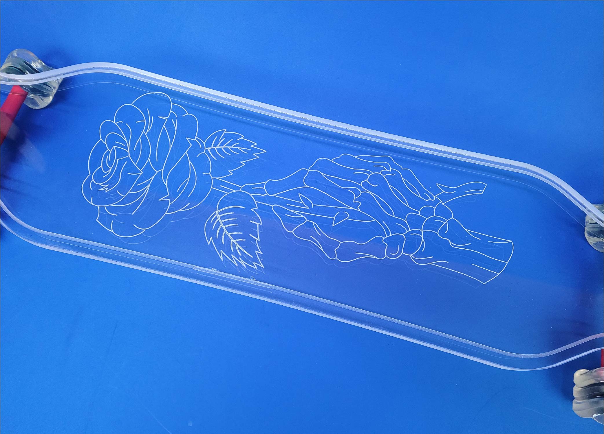 This board is a 40″ platypus design with our Skeleton Rose design. It comes with red trucks and clear black Shark wheels.