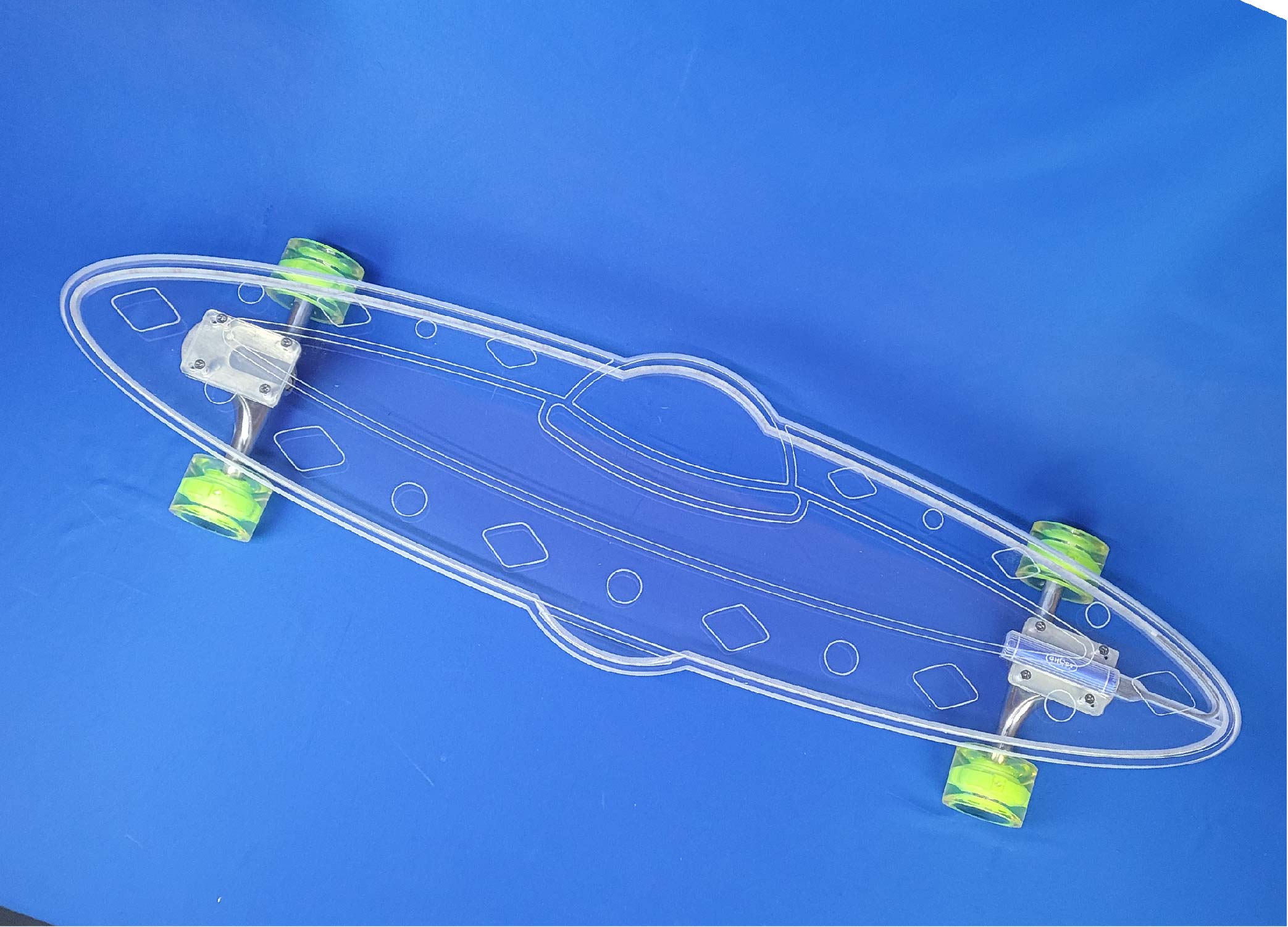 This board is the 40″ UFO design with full LEDs in the deck. It comes with silver trucks and green LED wheels.