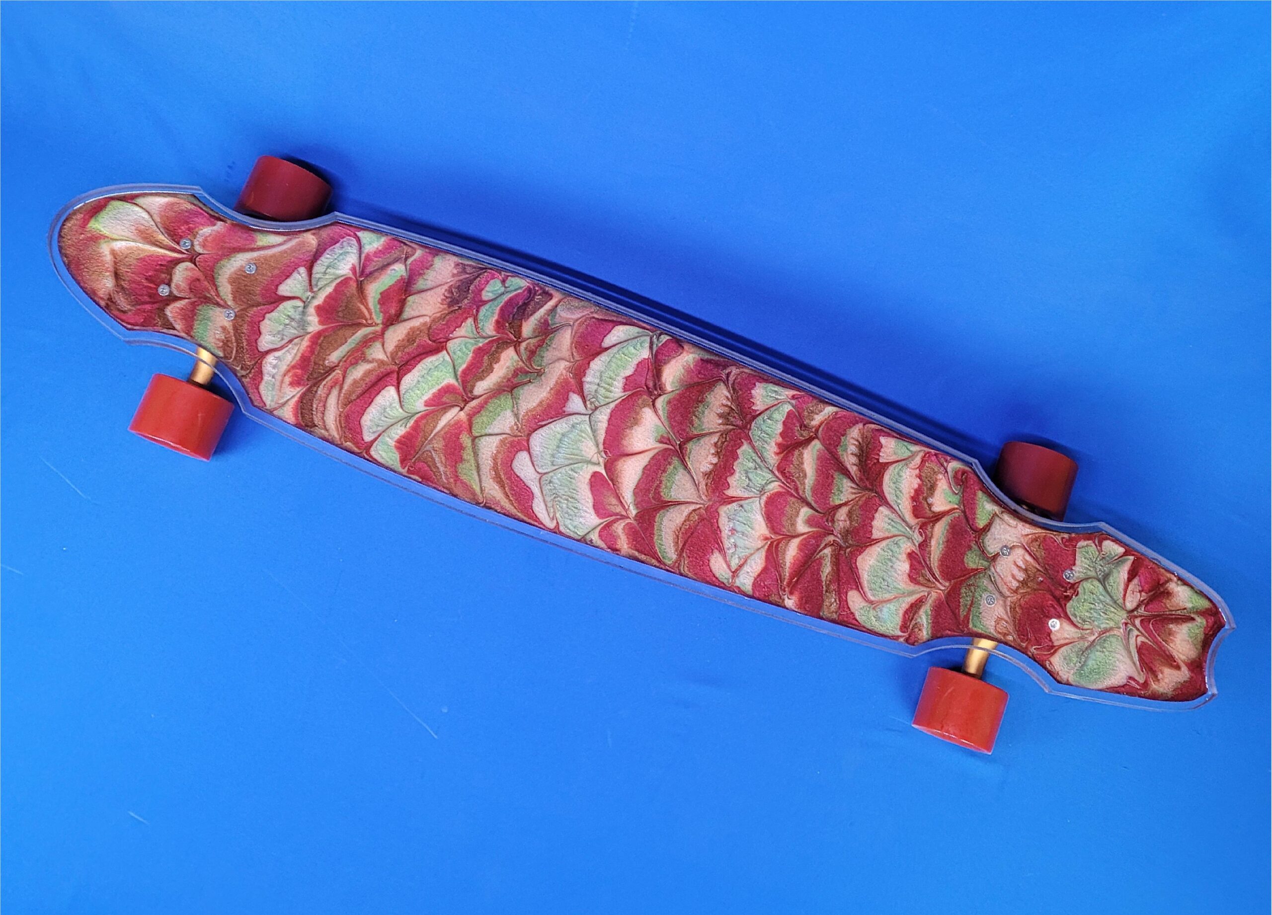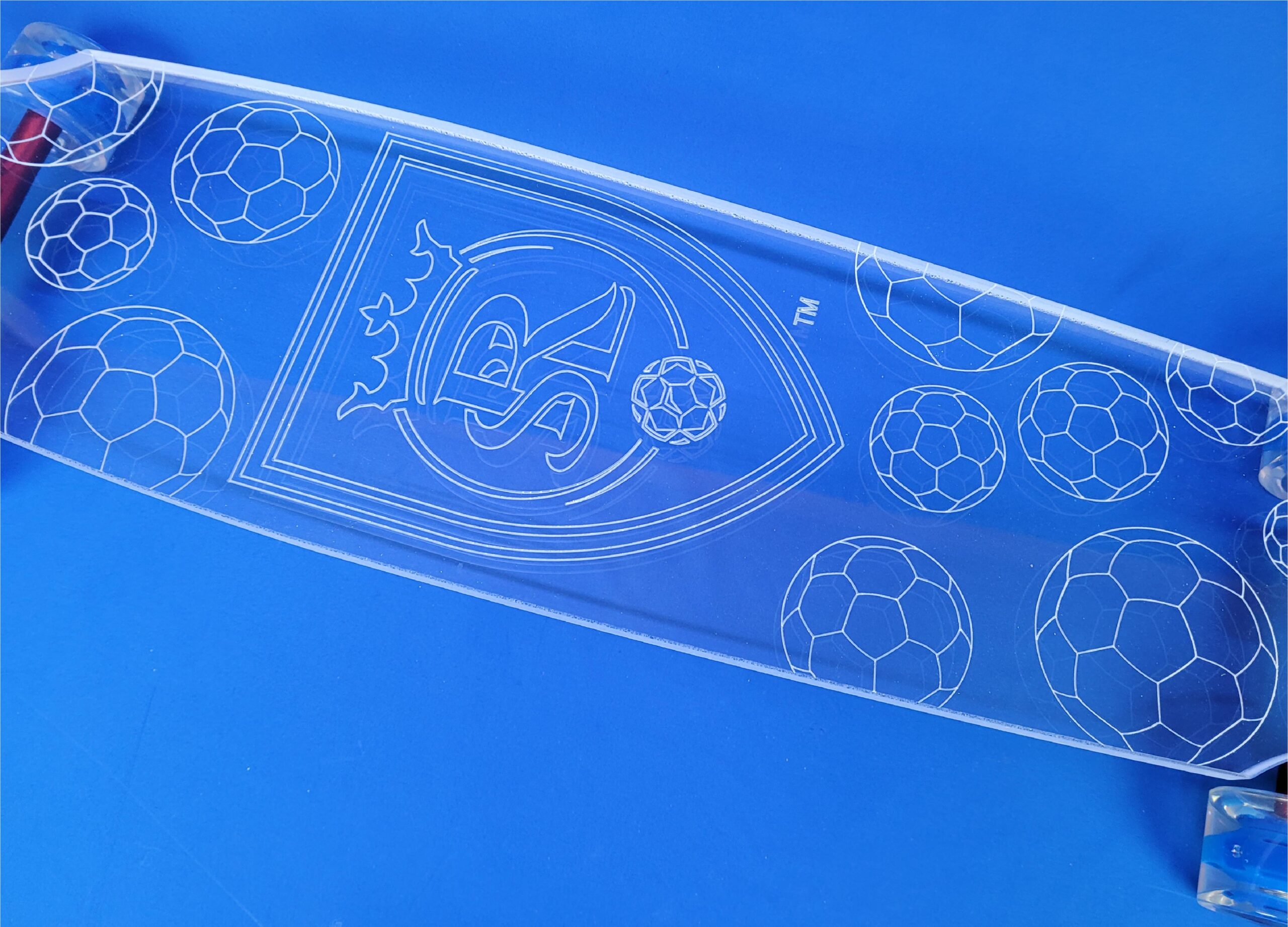 This board is a 40″ wheel cut with a custom Real Salt Lake design. It has metallic red trucks and blue LED wheels.