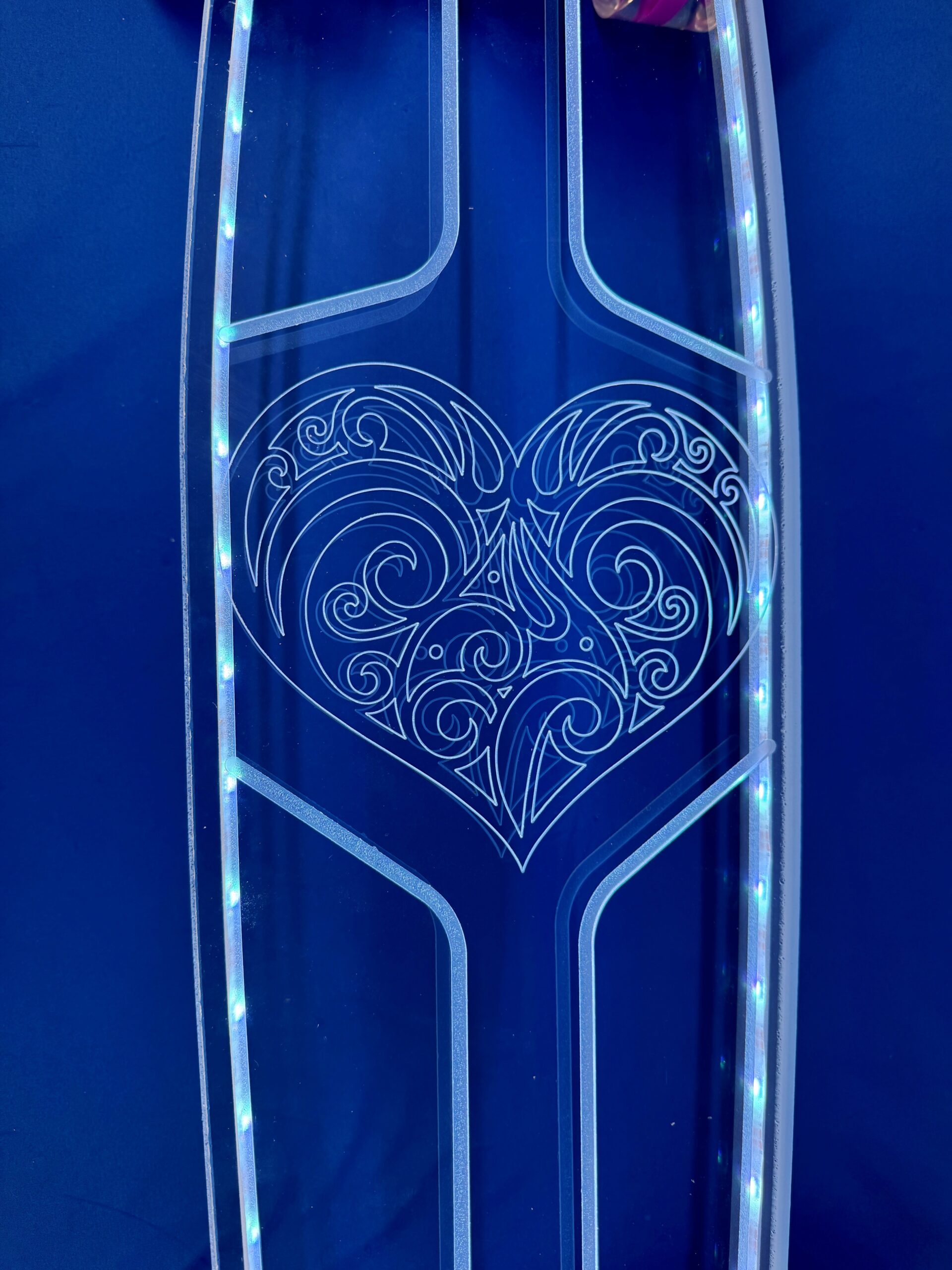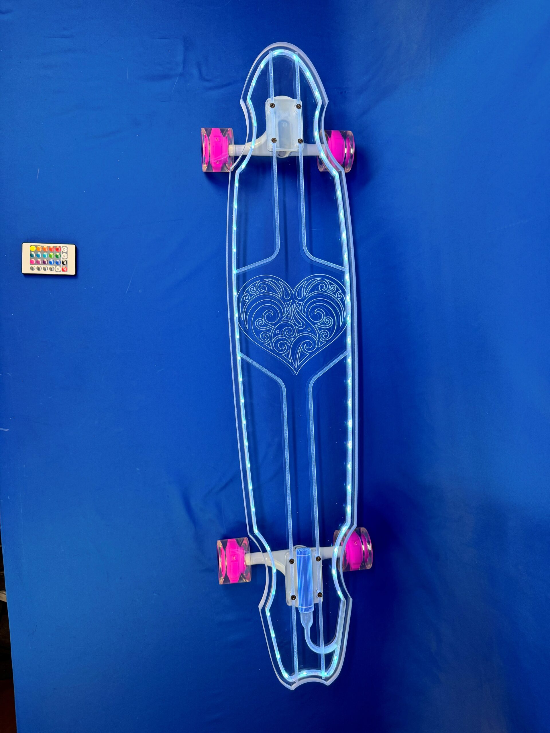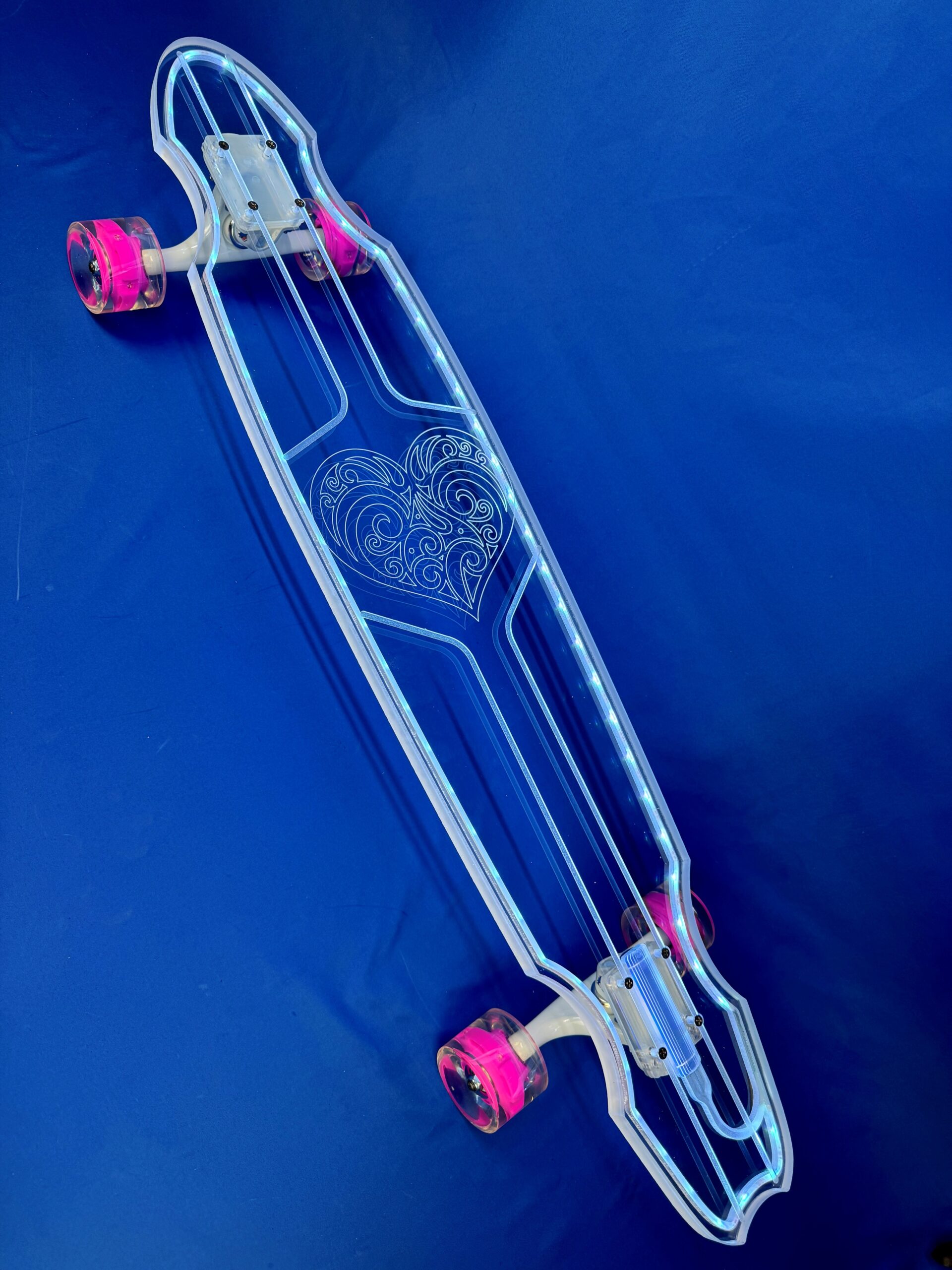Our Electric LED Ghost Heart custom longboard comes with exciting features. For example, it is equipped with LED lights inside the acrylic and a rechargeable battery pack. Additionally, the board includes: