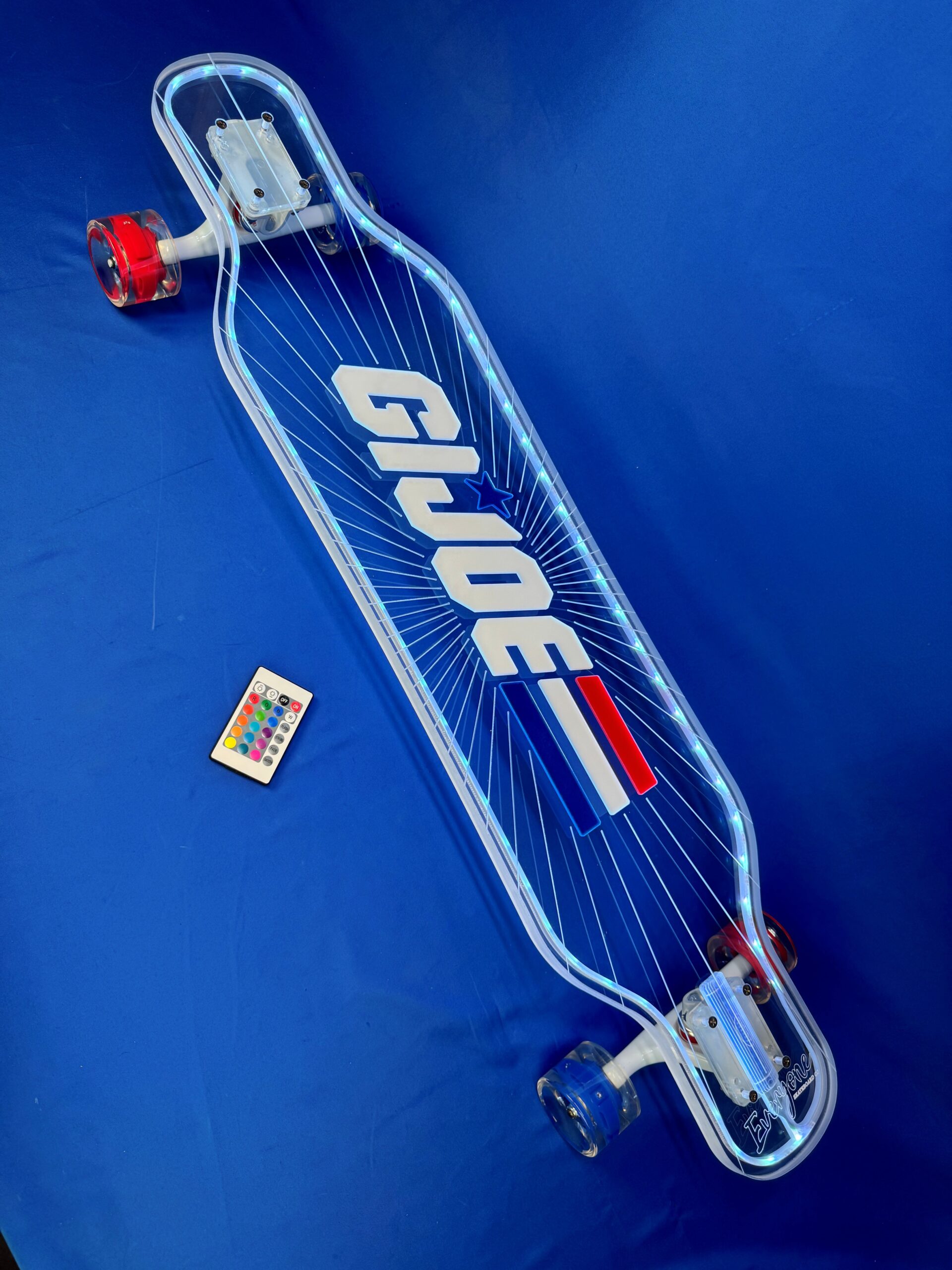 Each Custom LED Longboard G.I. Joe x Everyone Skate x Ghost Boards x Hasbro features a clear acrylic deck with built-in LEDs, White 180mm Ghost trucks, Blue & Red LED wheels, and Abec 7 Ghost bearings. The 40″ Platypus shape delivers superior control for beginners and pros alike.