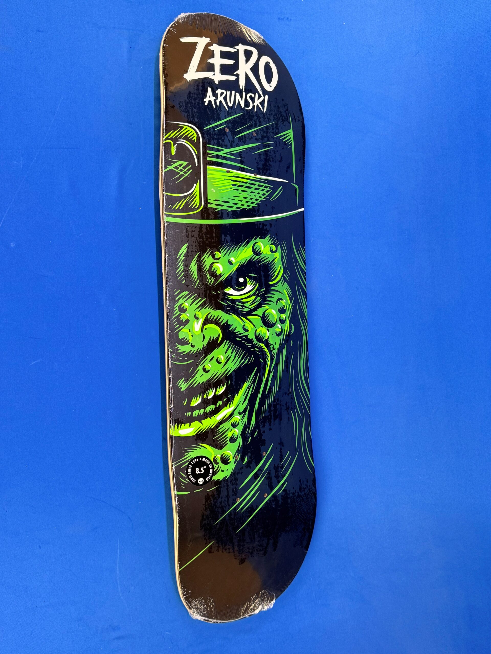 The Zero Arunski Fright Night 2 Leprechaun 8.5″ Skateboard Deck features bold horror-style artwork and durable maple construction. The 8.5″ width offers a stable, responsive ride for street or park skating.